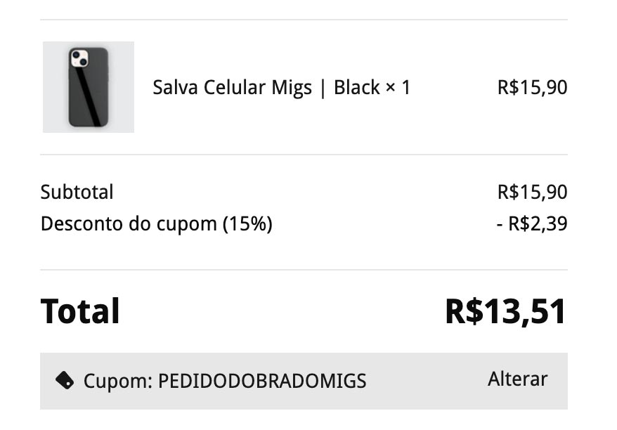 Com os 15% OFF, a migs vai sair R$13,51 e você vai receber seu pedido duplicado!